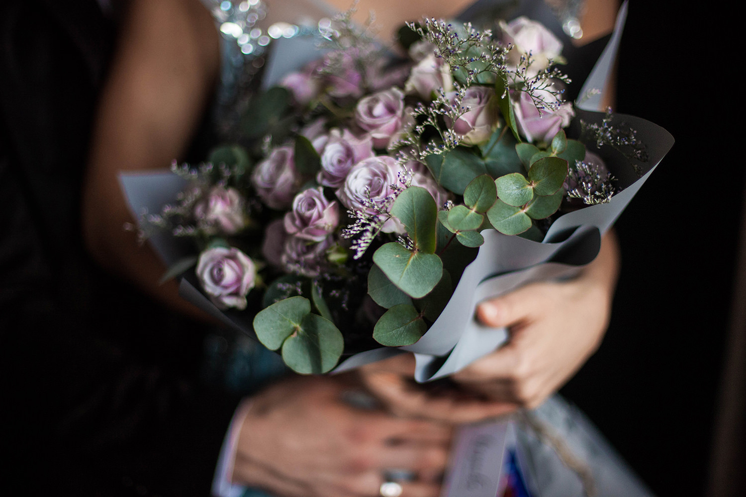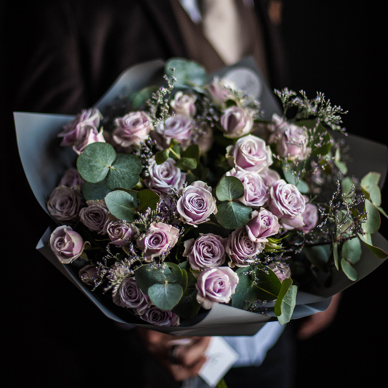 Букет в упаковке. В составе: Роза Silver Shadow, Лимониум Beltlaard, Эвкалипт Cinerea