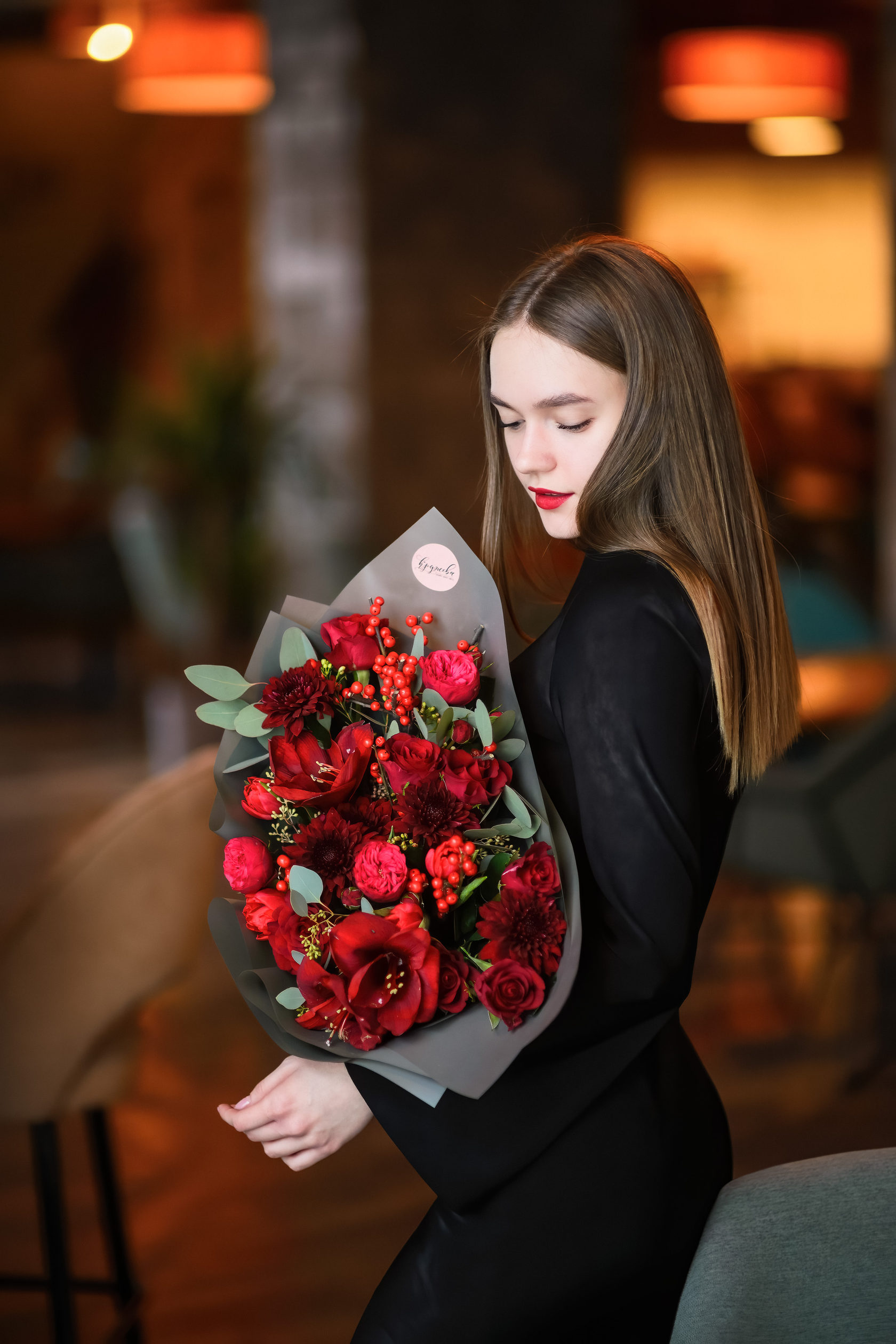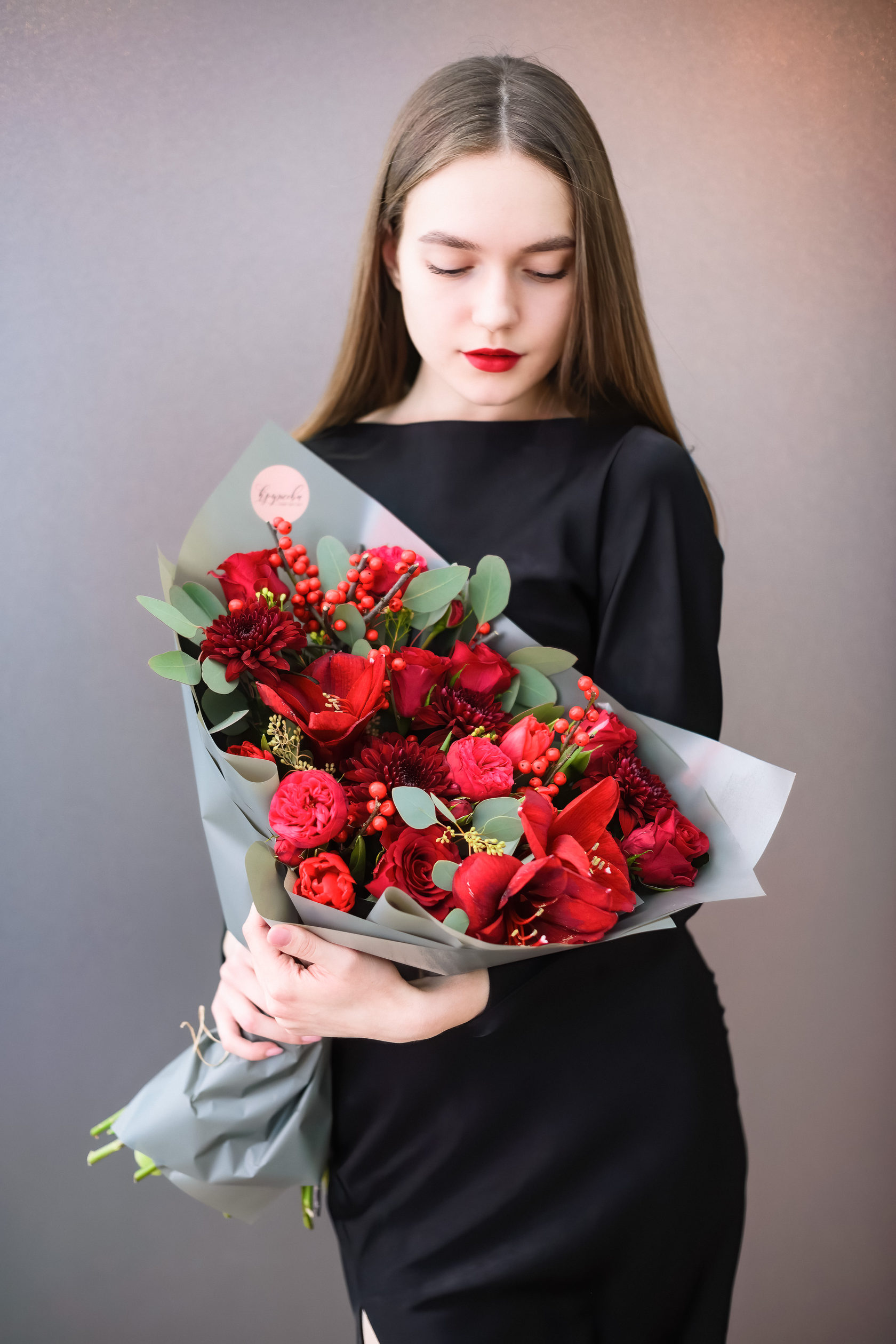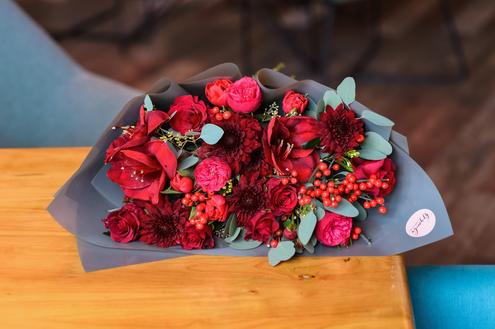 Яркий насыщенный букет с различными оттенка красного цвета, в составе: амариллис, розы сорта Piano Freiland, Burgundy, хризантемы Bigoudi, илекс, хамелациум, тюльпаны Red Princess, эвкалипт