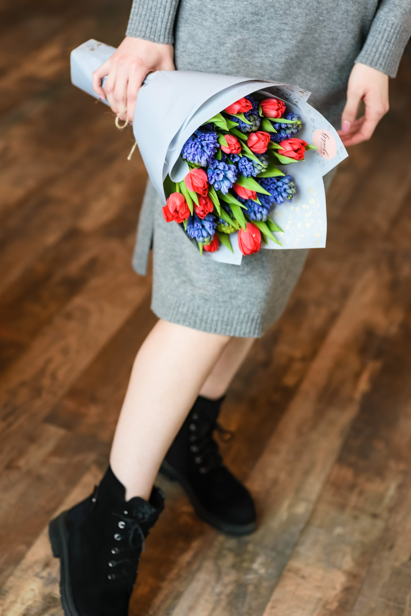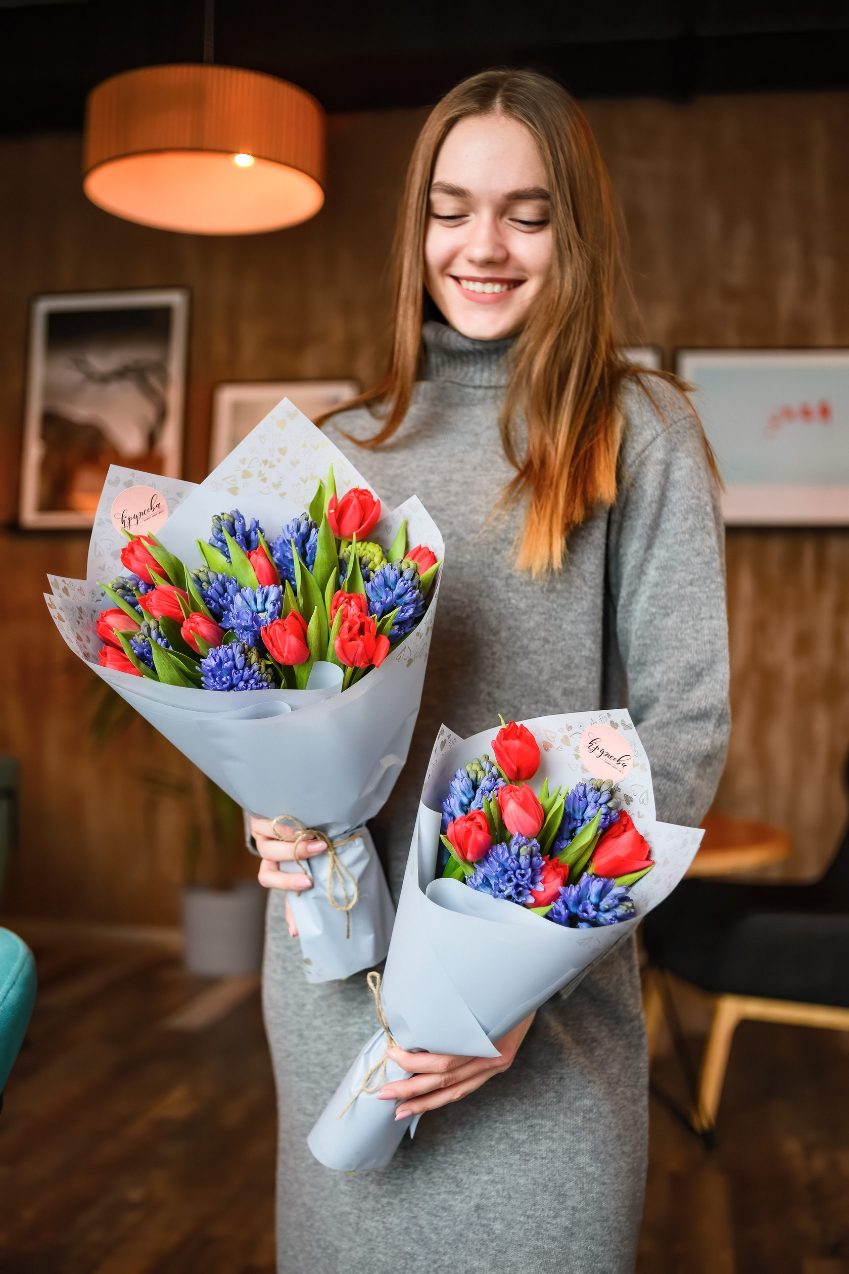 Размер S 8340 KZT, размер М 17600 KZT Охапка весенних цветов: контрастное сочетание гиацинтов и тюльпанов